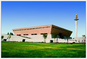 洛陽博物館新館工程位于洛南新區,是洛陽市重點工程,總建筑面積為43654㎡,框架結構。是集文物展示、收藏、科研、游覽休閑為一體的綜合性展館,也是新中國成立以來洛陽市投資規模及建筑面積最大的公益性文化建設工程。 該館由主樓二層,附樓三層組成。主樓一層設置中央大廳、基本陳列展廳、機動展廳和互動展廳等,二層為專題陳列展廳;附樓為文物庫房、辦公及學術研究場所。主入口位于展館正面偏西,為展館南墻的黃金分割點。門廳及一層內走廊使用干掛洞石,色澤均勻,對縫光滑平順。電視電話會議室等墻面為軟包墻面,圓弧造型吊頂裝修典雅、大方。 本工程外形如“大鼎”型建筑,主體部分東西長143.4m,南北寬243.3m,由展館二層,輔樓三層,下沉廣場,跌落水池和觀光塔組成。結構形式為框架結構,抗震等級二級,抗震設防烈度七度,耐火等級一級。展館及輔樓為獨立基礎及條形基礎,柱、梁、板、樓梯混凝土統一為纖維混凝土。外墻及地下室為空心砌塊,內墻為加氣砼砌塊。展館二層傾斜外墻為松本泰安板。 工程由河南國安建設集團有限公司總承包施工。